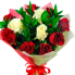 Классический букет из красных роз, по середине белые с добавлением рускуса (зелени) и в упаковке. Букет представлен в трех вариантах: классический (11 роз), стандарт (15 шт.) и VIP (19 шт.).